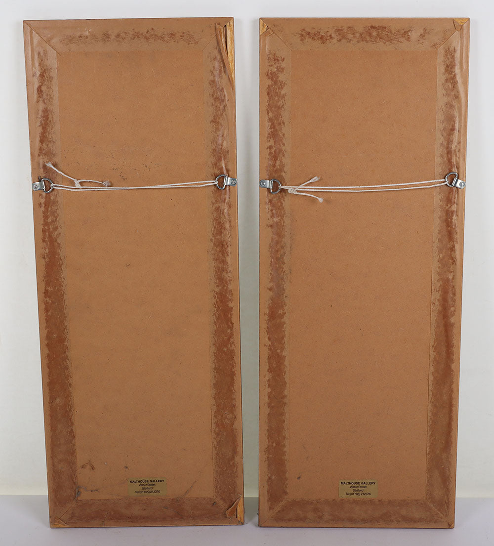 Two wood and glass frames containing coloured sketched postcards of Tommy's Life by Fergus Makin.
