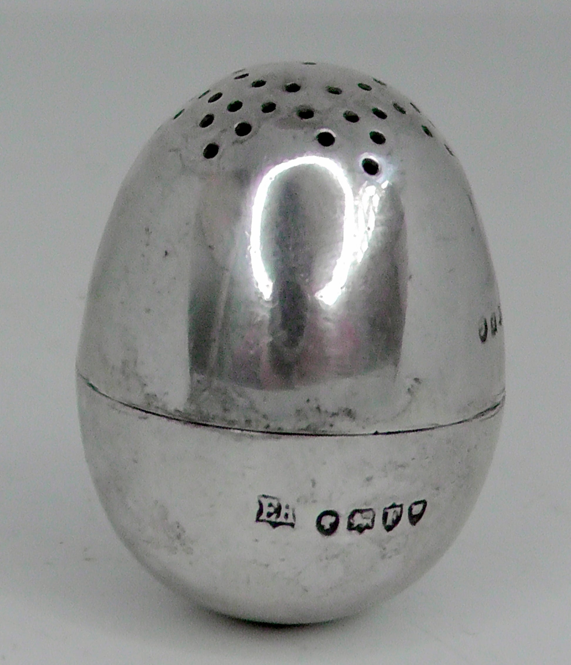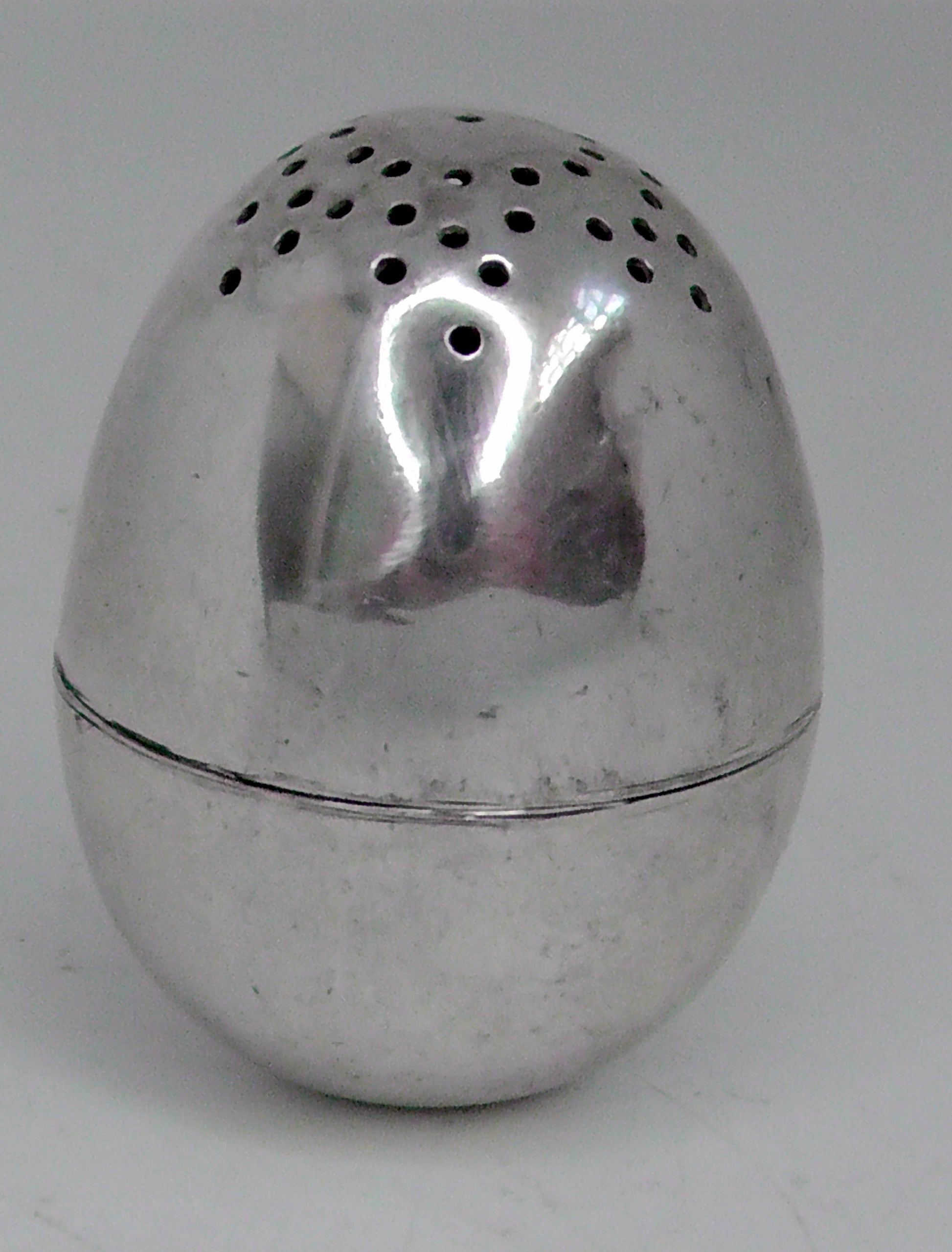 A solid silver egg shaped pepperette